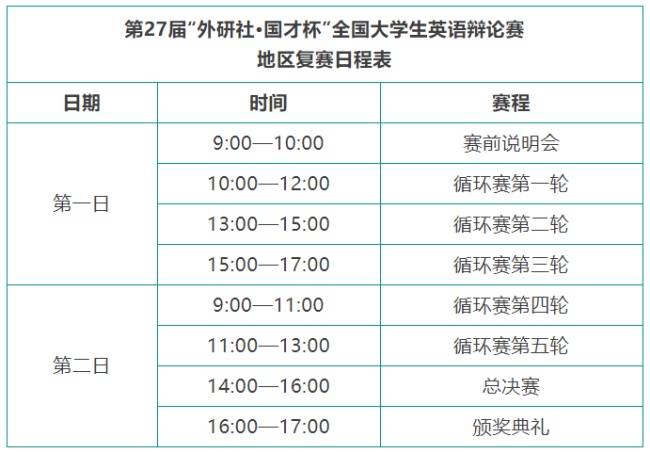 第27届“外研社·国才杯”全国大学生英语辩论赛地区复赛包含五轮循环赛和总决赛。在循环赛环节,各参赛队伍须完成5轮比赛获得相应积分。最后,积分排名靠前的队伍获得全国决赛的参赛资格。