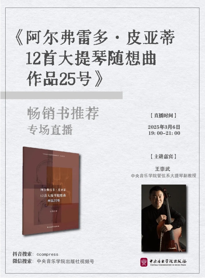 3月6日(本周四)晚19:30,中央音乐学院管弦系大提琴副教授王崇武作客中央音乐学院出版社直播间,带来《阿尔弗雷多·皮亚蒂12首大提琴随想曲 作品25号》畅销书专场推荐直播!作为大提琴技术训练的高点作品之一,皮亚蒂随想曲以丰富的音乐性与技巧挑战性闻名。王崇武老师将结合多年学习、教学与演奏经验,进一步剖析作品的艺术价值、练习要点及实战应用,并分享本书编撰背后的匠心故事。
