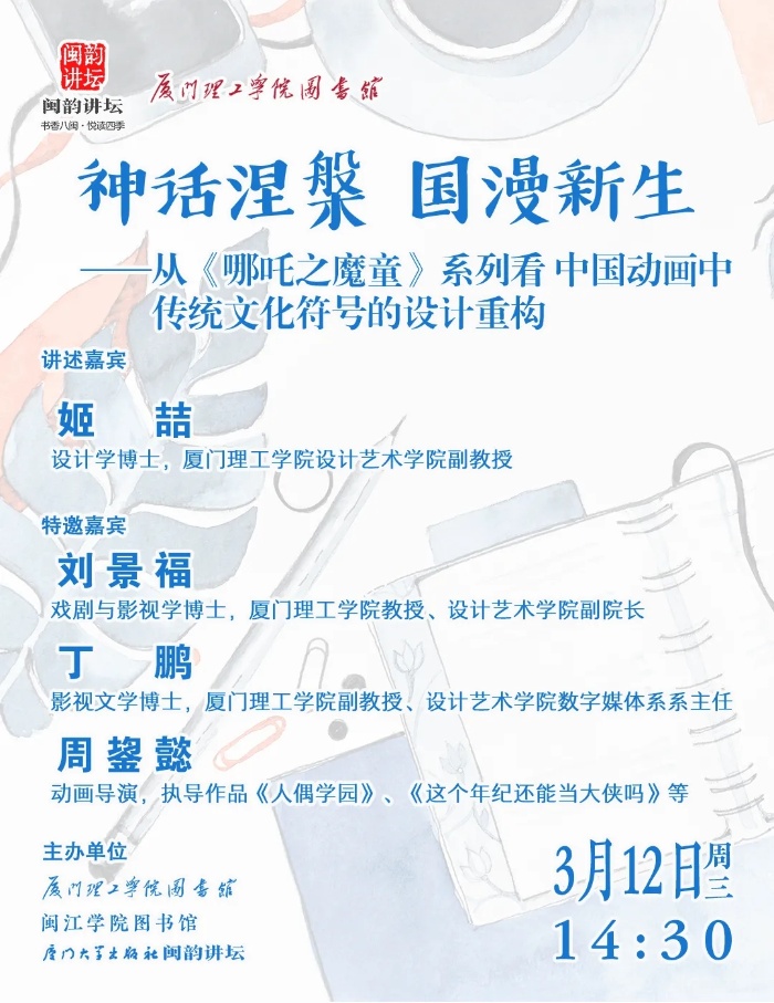 3月12日,闽韵讲坛特邀厦门理工学院设计艺术学院副教授姬喆、副院长刘景福、系主任丁鹏以及业内专家周鋆懿,从中国动画研究、文化海外传播、编剧导演思路、业界实战经验,多重维度视角,带你了解动画背后的深层逻辑。