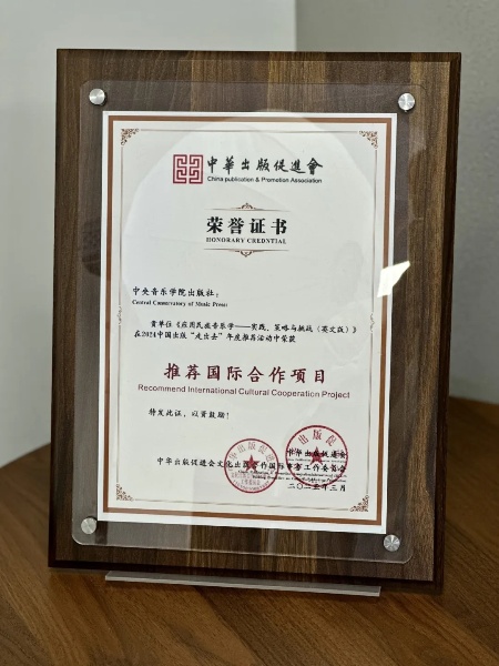 近日,在广西桂林举办的“2025全国新闻出版单位国际出版合作工作交流会”上,中央音乐学院出版社出版的《应用民族音乐学——实践、策略与挑战(英文版)》荣获2024中国出版“走出去”年度推荐活动奖项。中华出版促进会国际工委主任委员李大伟莅临该社进行考察,并专程颁发奖项。