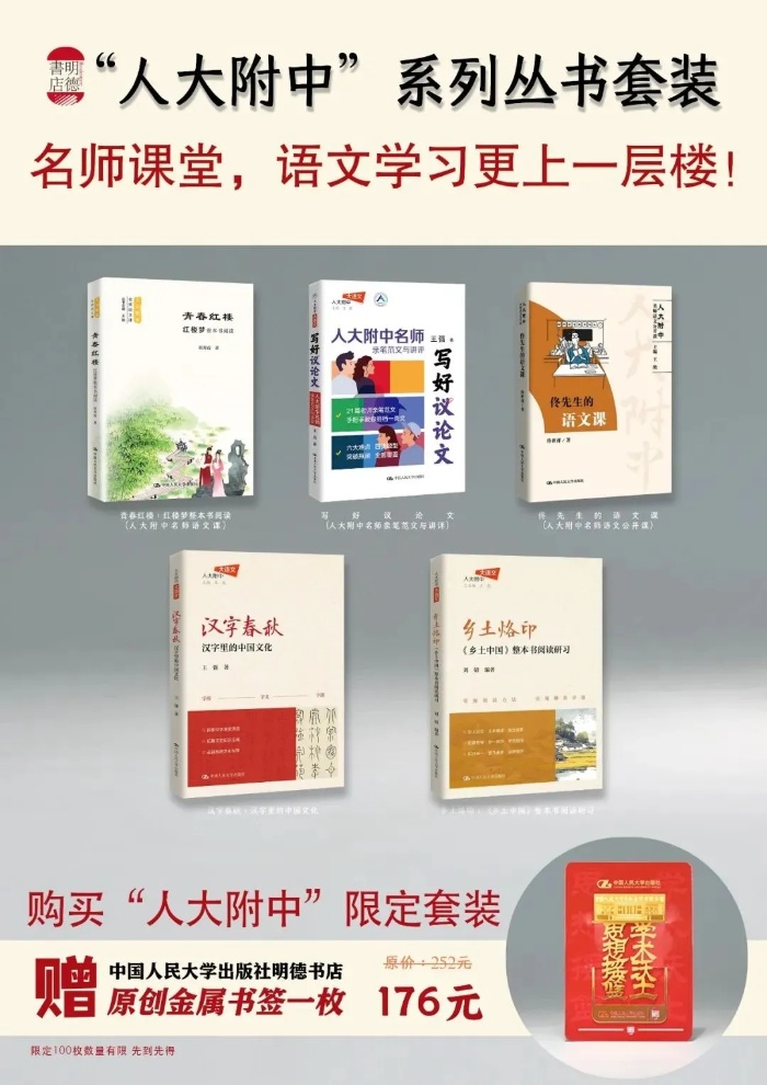 套装专享,限量书签赠送:我们特别推出了语文课等共五本“人大附中”图书的超值套装。购买该套装,即可获赠明德书店原创金属书签一枚。这款书签设计精美,独具匠心,将成为您阅读时的贴心伴侣,让您在翻动书页间感受独特的文化韵味。数量有限,先购先得!