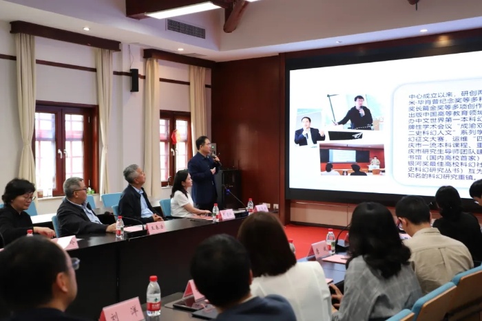李广益首先发言,对中心在人才培养、学术研究、创意写作等方面开展的工作进行了介绍。近年来,中心在外促进成渝双城科幻圈兴旺发展,在内营造氛围融洽的师生共同体,在组织学术活动、建设图书品牌、编写科幻教材、开设科幻课程等方面取得了丰硕成果。2023年1月,“科幻文学与科技人文”研究生导师团队成功入选重庆市研究生导师团队建设名单。未来,中心将通过系列活动,进一步推广跨地域、跨学科的科幻学术交流与人才培养,扩大社会和国际影响,成就蜚声海内外的科幻重镇。