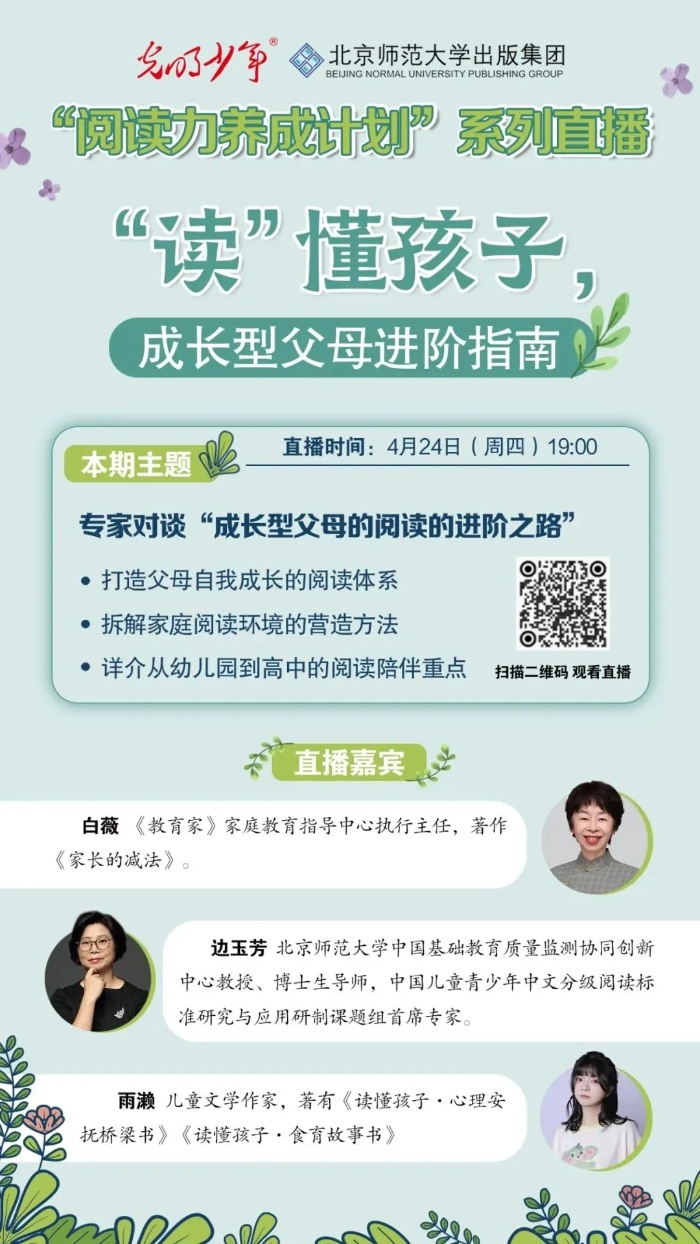 直播汇集北师大专家学者、北京市一线名师、北师大出版社资深编辑,以前瞻的理念、科学的方法,全面赋能家长,构建家庭阅读体系,让家长真正成为孩子阅读之路上的良师益友。