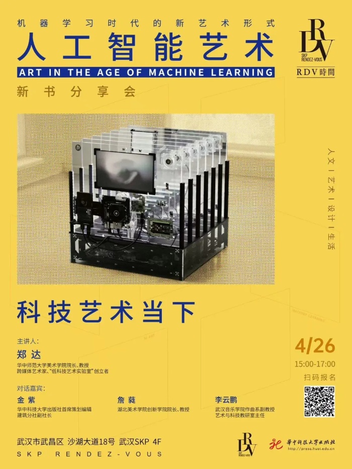 2025年4月26日(周六)15:00,《人工智能艺术:机器学习时代的新艺术形式》的译者郑达将携湖北美术学院创新学院院长詹蕤、武汉音乐学院作曲系副教授李云鹏、华中科技大学出版社首席策划编辑金紫一起做客武汉SKP 4F SKP RENDEZ-VOUS,联袂进行一次“技术-艺术-哲学”的跨界对话,围绕AI时代下的认知革命、艺术主体重构和技术伦理展开讨论,重点聚焦于当代艺术中AI的应用现状及中国背景下的创新实践与挑战。