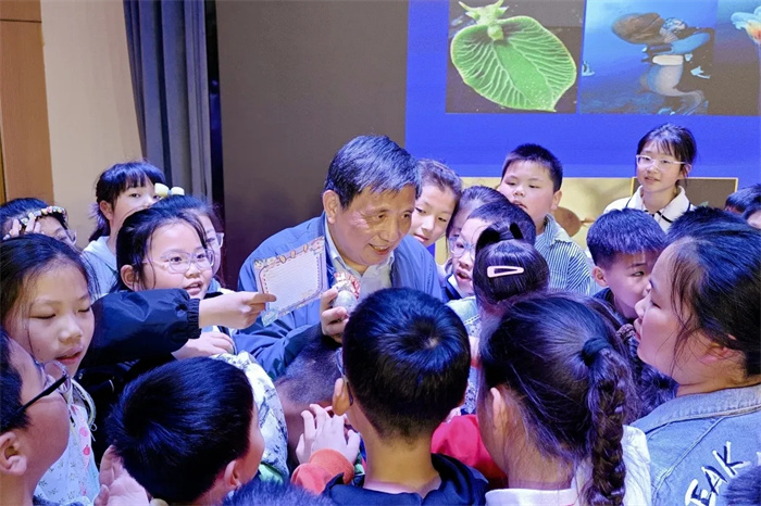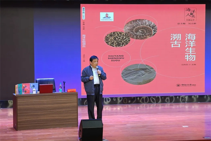 4月20日下午,中国海洋大学出版社携手青岛市李沧区新华书店、盐城市图书馆共同举办了“深海黑暗精灵群科普讲座”。盐城市少儿图书馆雏鹰剧场化作“海洋探秘基地”,中国科学院南京地质古生物研究所冯伟民研究员化身“科学导游”,带领200余名青少年探索黑暗却生机勃勃的深海世界。冯老师用生动有趣的语言,介绍了奇妙的热液生物、冷泉生物、深海珊瑚、深渊生物,揭示了极端环境下这些生物生存的“智慧”。互动环节中,孩子们争相举手,提出自己的疑问,分享自己的收获。冯老师耐心答疑解惑,激励孩子们在知识海洋中扬帆逐浪。活动现场还特别设置海洋主题微型图书展区,使小读者们在沉浸式阅读中深化对海洋精灵的认知,悄然播撒下探索海洋科学的兴趣种子。