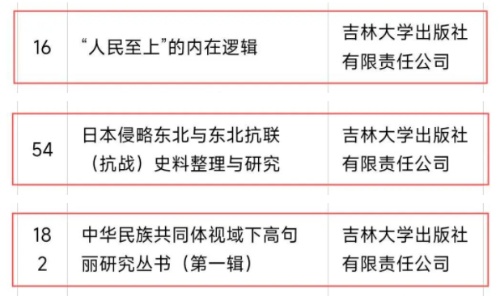 吉林大学出版社申报的《“人民至上”的内在逻辑》《日本侵略东北与东北抗联(抗战)史料整理与研究》《中华民族共同体视域下高句丽研究丛书(第一辑)》成功入选。