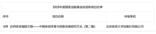 近日,2025年度国家出版基金资助项目评审结果正式公布,北京体育大学出版社组织申报的“迈向体育强国之路——中国体育改革与创新发展研究文丛(第二辑)”获得资助。