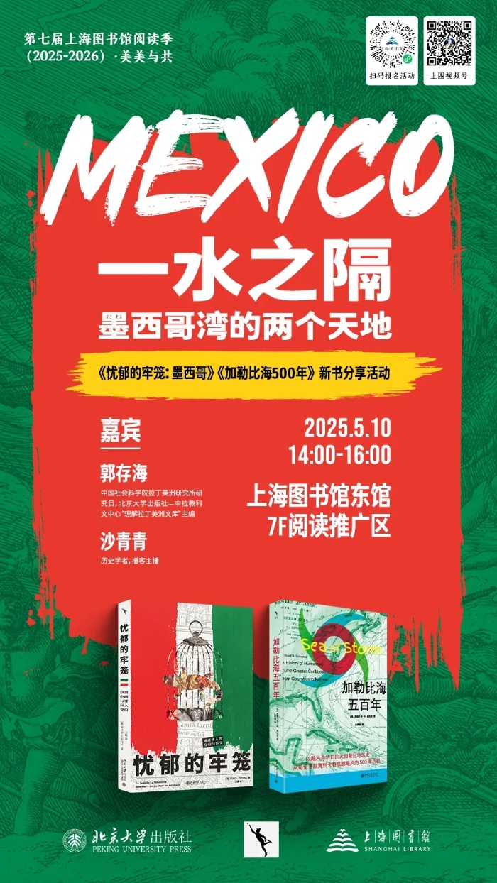2025年5月10日14:00,上海图书馆和北京大学出版社共同策划“一水之隔:墨西哥的两个天地——《忧郁的牢笼:墨西哥》《加勒比海500年》新书分享活动”,邀请中国社会科学院拉丁美洲研究所研究员,北京大学出版社—中拉教科文中心“理解拉丁美洲文库”主编郭存海先生和历史学者、播客主播沙青青先生对谈,为读者朋友们分享今年理解文明书系的两本新书内容。