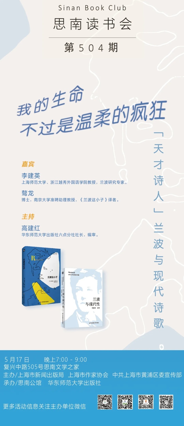 1991年,在诗人兰波逝世一百周年之际,法国作家皮埃尔·米雄推出了一部致敬兰波的传记式虚构作品《兰波这小子》,以独特的方式讲述了不一样的兰波。一个诗人,百年传奇。兰波的反叛人生和天才创作,不仅激发了作家的丰富想象力,更是让无数学者为之皓首。兰波的魅力究竟何在?兰波研究专家、《兰波与现代性》主编李建英教授与《兰波这小子》译者、南京大学骜龙博士将分别从研究者和翻译者的角度为大家带来一场关于兰波、关于现代诗歌、关于当代法国文学的精彩对话。