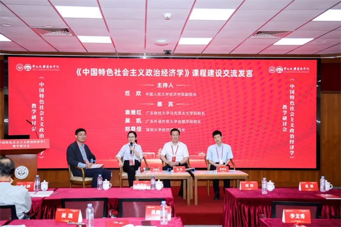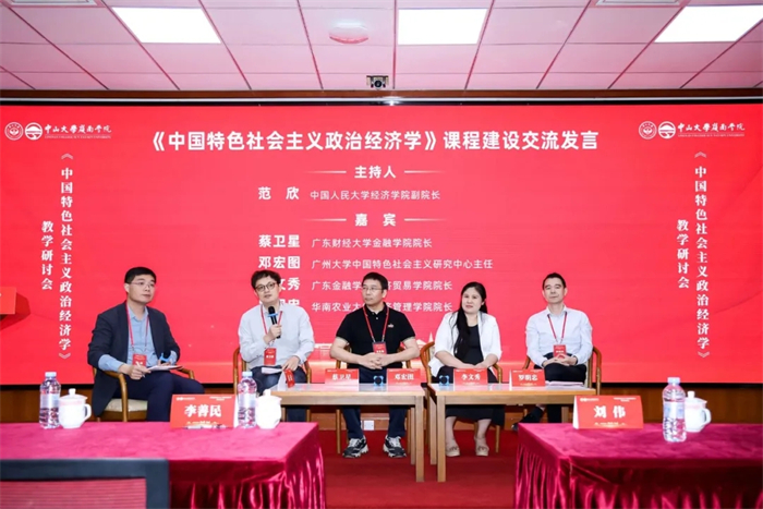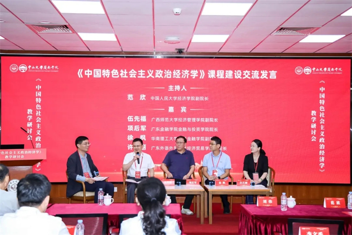 课程建设交流发言阶段由中国人民大学经济学院副院长范欣主持。广东财经大学金融学院院长蔡卫星、广州大学中国特色社会主义研究中心主任邓宏图、广东金融学院经济贸易学院院长李文秀、华南农业大学经济管理学院院长罗明忠、广西师范大学经济管理学院副院长伍先福、广东金融学院金融与投资学院院长项后军、华南理工大学经济金融学院副院长徐枫、广东外语外贸大学经济贸易学院副院长许月丽、广东财经大学马克思主义学院院长袁继红、广东外语外贸大学金融学院院长展凯、深圳大学经济学院院长郑尊信分别就“《中国特色社会主义政治经济学》课程建设”进行了研讨发言。