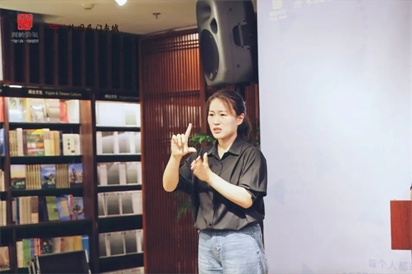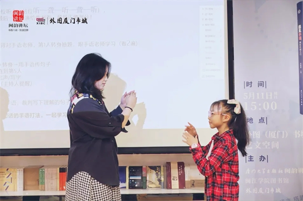 5月11日,由外图厦门书城、闽江学院图书馆和厦门大学出版社联合主办的闽韵讲坛第五期“以手为声赋形,传递‘不说话的爱’”暨《遇见手语:趣味手语入门》新书发布活动在外图厦门书城三楼艺文空间火热开场。厦门大学外文学院教授、《遇见手语:趣味手语入门》主编肖晓燕老师担任主讲人,该书三位编者——聋人手语博主蔡鸿美(瘦瘦)、徐林(胖胖)和中学教师李萌——共同参加对谈。本次讲坛现场配有两名专业手语翻译员,为场内外的聋人朋友提供无障碍服务。活动实况通过厦门大学出版社微信视频号、抖音、小红书、哔哩哔哩平台同步直播,《读者》杂志官方微博平台转播,全网浏览量达3.9万。