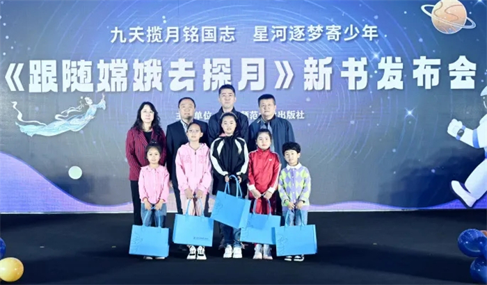 本书作者李旭、出版社总编辑张恰与两位小朋友一起,为《跟随“嫦娥”去探月》新书发布揭幕。