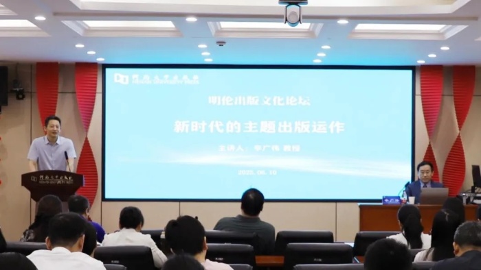 6月10日,河南大学出版社明伦出版文化论坛迎来了一场主题为“新时代的主题出版运作”的学术盛宴。人民出版社原总编辑辛广伟做客论坛,结合自身丰富的出版实践,深入探讨如何在新时代背景下做好主题出版工作。讲座由出版社总编辑孔令刚主持,出版社领导班子及全体编辑参加。