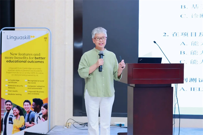 在专题报告环节,剑桥大学出版与考评院大中华区认证总监李文凯详细解读了剑桥ILA“教—学—评”一体化教育生态系统的先进理念与优势,并介绍了以“剑桥英语水平测试”为代表的人工智能赋能语言测评创新实践。北京师范大学外文学院罗少茜教授则从学术角度分享了计算机自适应测评的理论及应用价值。