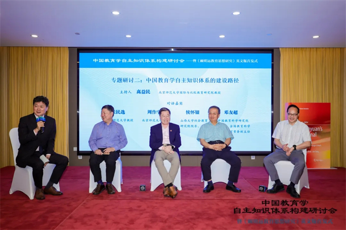第二场专题研讨由中国教育科学研究院研究员、全国教育科学规划办公室常务副主任邓友超做引导报告,北京师范大学高益民教授主持圆桌研讨,上海师范大学张民选教授、北京师范大学周作宇教授、山西大学侯怀银教授围绕“中国教育学自主知识体系的建设路径”主题展开对话。