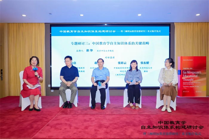 第三场专题研讨由北京师范大学褚宏启教授做引导报告,北京师范大学郭华教授主持圆桌研讨,北京大学蒋凯教授、《教育研究》主编张彩云研究员、北京师范大学张东娇教授围绕“中国教育学自主知识体系的关键范畴”主题展开对话。
