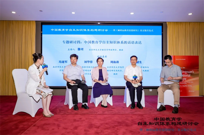 第四场专题研讨由南京师范大学冯建军教授做引导报告,北京师范大学滕珺教授主持圆桌研讨,中国教育报刊社刘华蓉编审、北京师范大学周海涛教授、北京师范大学马健生教授围绕“中国教育学自主知识体系的话语表达”主题展开对话。