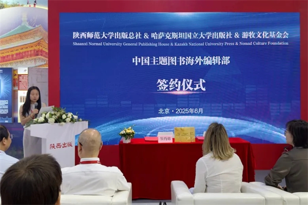 6月20日上午,在第31届北京国际图书博览会上,陕西师范大学出版总社与哈萨克斯坦国立大学出版社、游牧文化基金会举行成立“中国主题图书海外编辑部”签约仪式。哈萨克斯坦国立大学出版社代表、游牧文化基金会理事长白樱,智慧宫国际文化传播集团有限公司、阿联酋指南针出版社总经理马媛,陕西师范大学出版总社社长刘东风等参加了签约仪式。