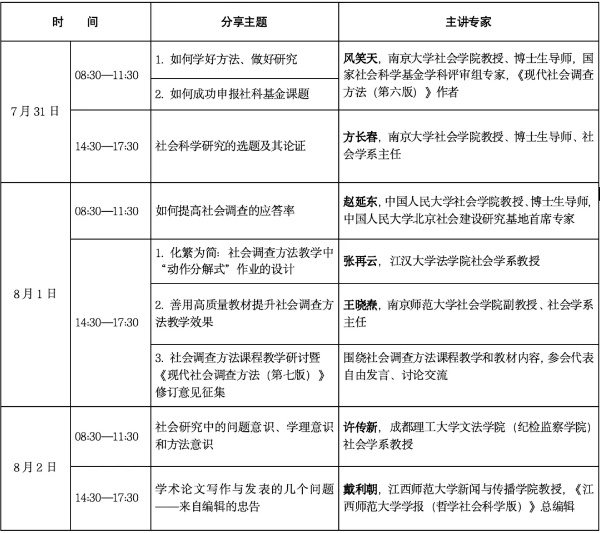 7月30日报到,7月31日至8月2日进行专题分享与研讨,8月3日离会。