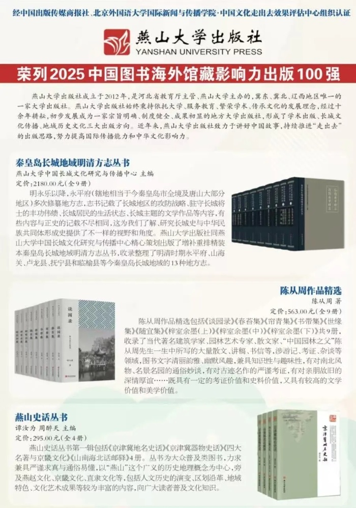 近年来,燕山大学出版社结合自身的出版优势与特色,致力于推动中国图书“走出去”,讲好中国故事,传播中华文化:《长城:追问与共鸣》《贝氏体钢中残余奥氏体》成功入选国家“丝路书香”工程,分别被翻译成印尼语、乌尔都语向“一带一路”沿线国家推荐;《中国长城》等实现英文版版权输出,将面向北美地区读者广泛传播;“长城遗产考古调查与研究”丛书(第一辑)入选2025年度国家出版基金资助项目;出版精品丛书“秦皇岛长城地域明清方志丛书”“陈从周作品精选”“燕山史话丛书”等,表明燕山大学出版社出版图书的思想价值和学术水平越来越被海内外读者肯定。今后,燕山大学出版社将继续奋进,力铸文化精品,为促进文化传承与发展,推动中华文化“走出去”贡献更多的力量。