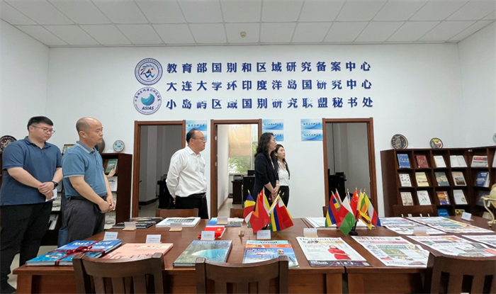 签约仪式前,刘文菁一行还到大连大学外国语学院(区域国别学院)与院长王晓军、党委书记李冰等院领导座谈,交流双方事业发展及党建情况,并参观了教育部国别和区域研究备案中心(大连大学环印度洋岛国研究中心)和大连大学红色基因主题馆,了解了大连大学发展的光荣历程与大连的红色教育发展史。