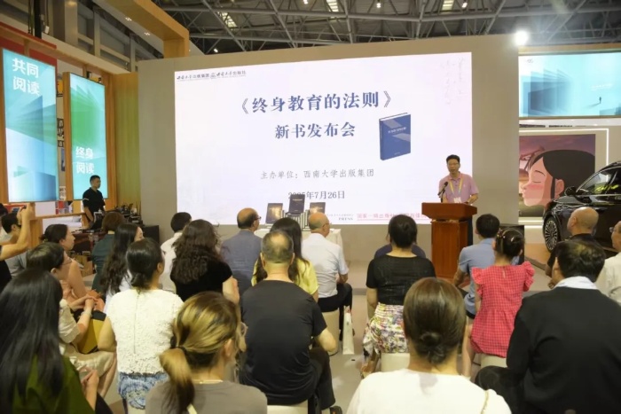 第33届全国书博会在重庆盛大召开,作为重庆本地出版单位之一的西南大学出版集团于26日下午在现场举行《终身教育的法则》新书发布会。出席新书发布会的嘉宾有西南大学出版集团总经理靳玉军,重庆师范大学杨如安教授,重庆第二师范学院张云平教授,《光明网》重庆频道主编黎奎、副主编陈林,重庆百货大楼股份有限公司董事会秘书、行政总监陈果,以及重庆青年职业技术学院智能制造学院党总支书记文智勇。