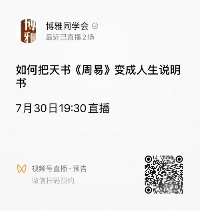《周易》作为群经之首,吸引了历朝历代最聪慧的头脑,无数学者皓首穷经,只为探寻易之大道。然而《周易》文字古奥、意义深邃,解卦尤难,因而也被称“天书”。寇方墀教授却把它写成“人生说明书”。本次直播寇方墀教授将跟大家分享学习《周易》的方法,以她全新力作《周易讲读(上·下)》为蓝本,示范把卦象爻辞转化为可落地的行动指南,并与博雅读书会的书友,共同探讨如何把神秘的符号变成日常智慧,让《周易》真正成为我们的人生导航仪。