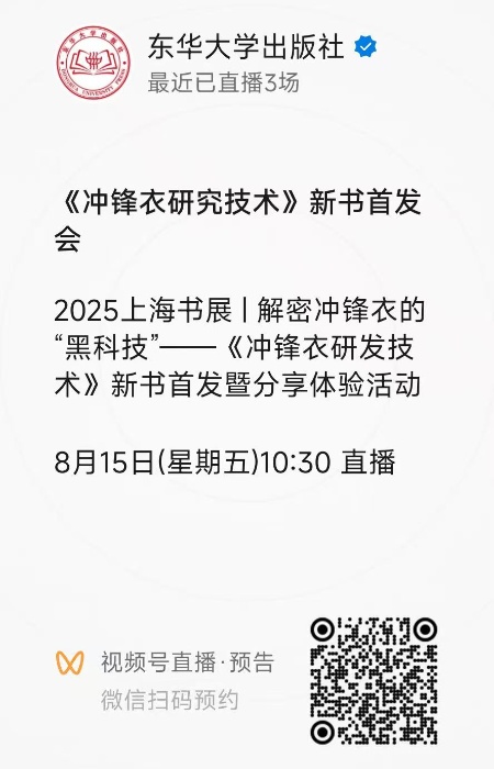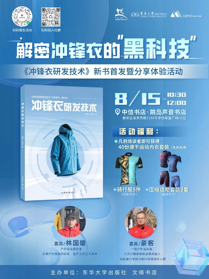 2025上海书展将于8月13日在上海展览中心开幕。8月15日(周五)上午10:30,由东华大学出版社主办,文绮书店协办的解密冲锋衣的“黑科技”——《冲锋衣研发技术》新书首发暨分享体验活动将在上海书展中信书店·跳岛声音书店与广大读者见面,新书首发活动等你来!
