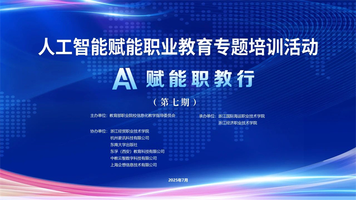 2025年7月31日—8月1日,由教育部职业院校信息化教学指导委员会主办,浙江国际海运职业技术学院和浙江经济职业技术学院承办,浙江经贸职业技术学院、东南大学出版社等单位联合协办的“人工智能赋能职业教育专题培训活动(第七期)——AI赋能职教行”在浙江舟山顺利举办。