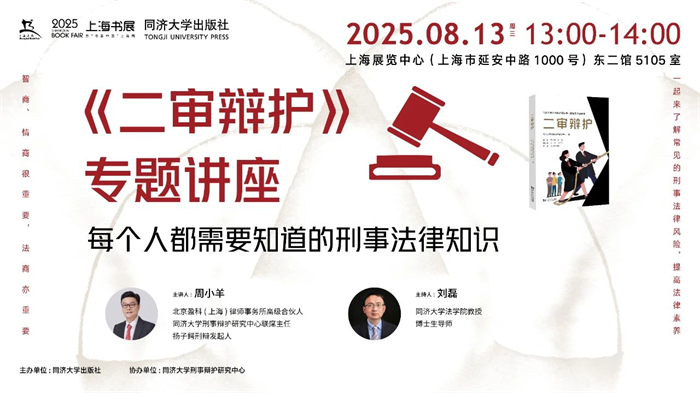每个人都需要知道的刑事法律知识——《二审辩护》专题讲座 8月13日13:00—14:00 嘉宾:周小羊 刘磊 地点:上海展览中心东二馆5105室