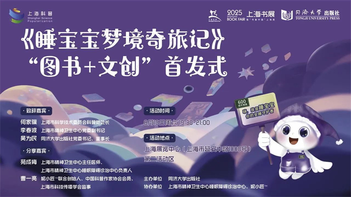 入选上海市“科技创新行动计划”科普专项项目(23DZ2303000)的《睡宝宝梦境奇旅记》(图书+文创)将于书展期间首发,您将有机会近距离感受“睡宝宝”的魅力,深入了解《睡宝宝梦境奇旅记》图书和文创的创作理念与独特价值。相信无论是关注自身和家人睡眠健康的您,还是对科普内容感兴趣的您,都能在此次活动中有所收获。期待您的莅临,让我们一同开启这场关于睡眠的奇妙旅程吧!