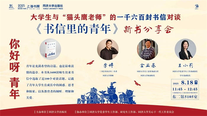 大学生与“猫头鹰老师”的一千六百封书信对谈:《书信里的青年》新书分享会 8月18日11:45—12:45 嘉宾:李博 金正基 王小莉 地点:上海展览中心东二馆5105室