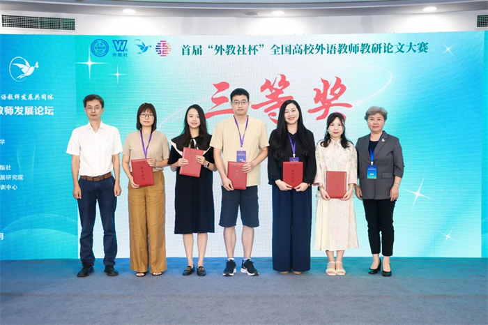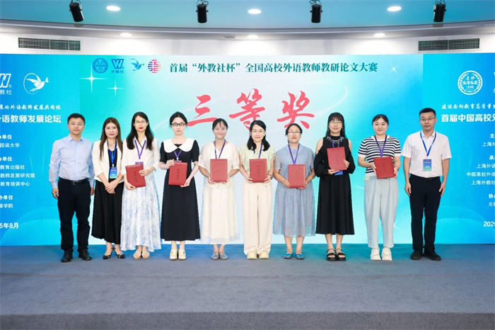 上海外语教育出版社党委书记、董事长孙玉,上海外国语大学教授赵蓉晖,上海外语教育出版社社长丁毅,电子科技大学教授胡杰辉,上海外国语大学教授王雪梅,复旦大学教授郑咏滟,安徽理工大学教授雷鹏飞,上海外语教育出版社副社长叶青为三等奖获奖选手颁奖。