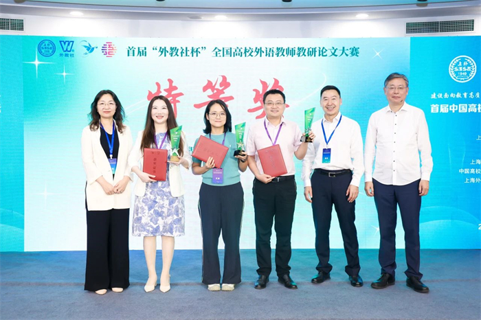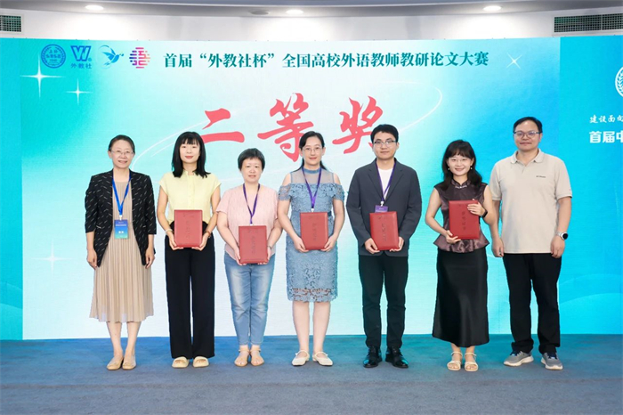 广东外语外贸大学副校长刘建达,浙江外国语学院副校长柴改英,上海外语教育出版社党委书记、董事长孙玉,上海外国语大学原副校长冯庆华,北京第二外国语学院党委常委张喜华,华中科技大学教授徐锦芬为二等奖获奖选手颁奖。