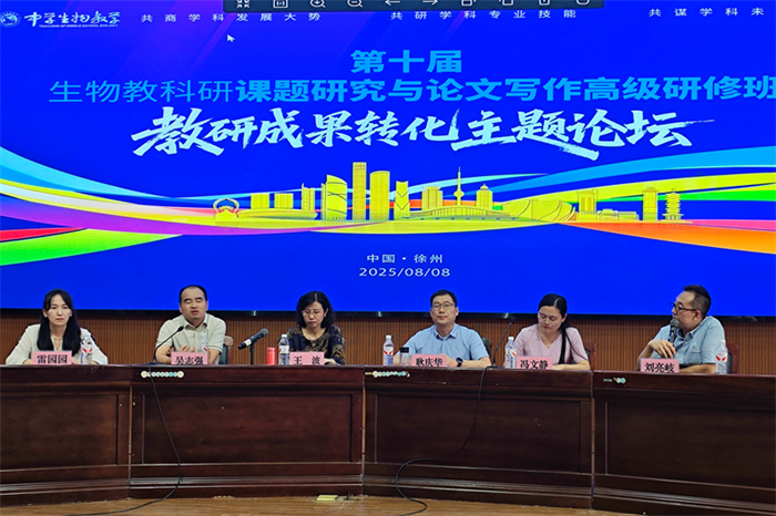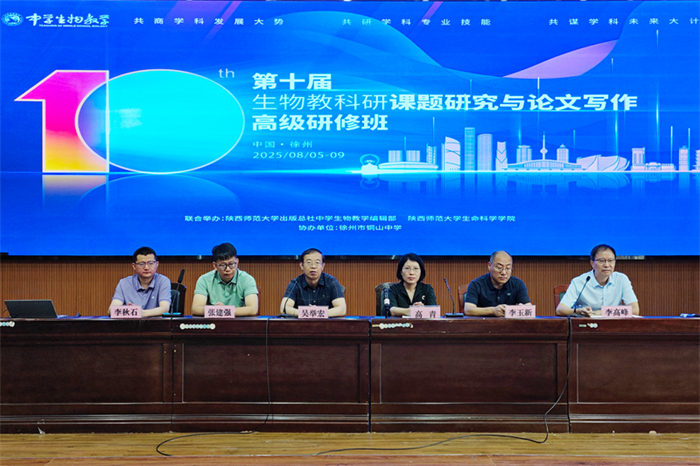 2025年8月5日—9日,由陕西师范大学出版总社中学生物教学编辑部、陕西师范大学生命科学学院联合举办,徐州市铜山中学协办的第十届“生物教科研课题研究与论文写作高级研修班”在徐州圆满召开,来自全国的480余名生物学教师线上、线下齐聚一堂,共商学科发展大势,共研学科专业技能,共谋学科未来大计。此次研修活动由开班式、课题研究报告、成功课题申报案例分享、论文写作报告、教研成果转化主题论坛、江苏师范大学标本馆参观六部分组成。