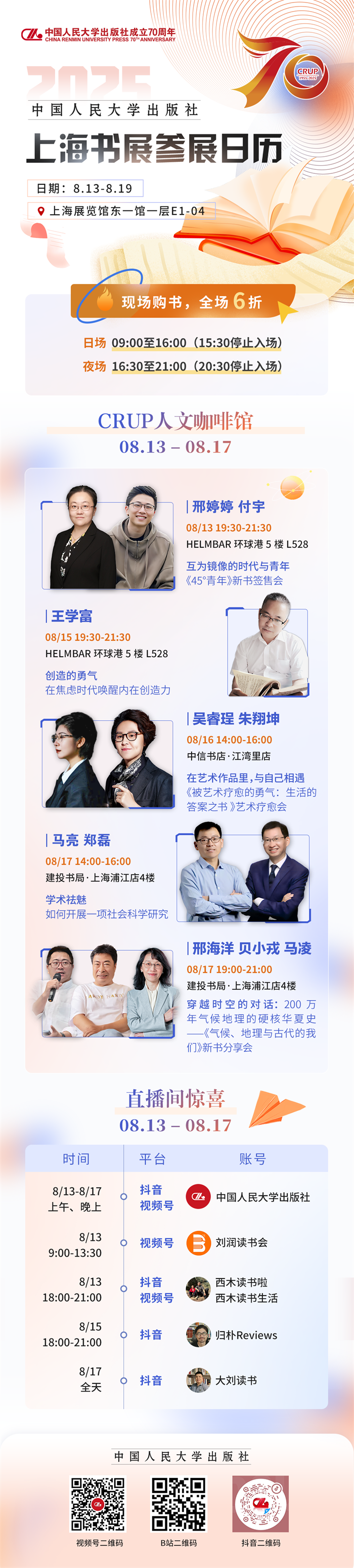 8月13日—8月19日 上海书展期间 中国人民大学出版社 (东一馆E1-04) 现场购书 展位图书全部6折, 满139还送精美手拎袋