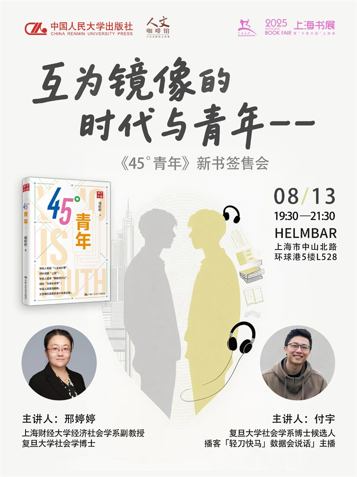 作者将分享《45°青年》出版的初衷、书籍从写作到出版过程中的一些故事。两位嘉宾将重点讨论时代如何影响青年,青年如何在时代转型的张力中找到平衡与稳定,进而形塑时代。