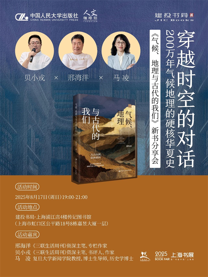 《三联生活周刊》资深主笔邢海洋携新书《气候、地理与古代的我们》,带你跨越200万年时空——从“郧县人”躲避的暴风雪,到“汴梁人”经历的黄河改道;从关中粮仓如何被寒潮击垮,到江南稻作怎样借季风崛起。这不是一场简单的读书分享,这是一次用冰芯、湖泥与古城遗址拼接出的“华夏生存录”。当过去的冷与热、旱与涝被放大到屏幕之上,你会突然读懂:为什么中原一次次“重启”,为什么江南成为“避风港”,为什么今天的我们,依然活在200万年前那阵风的回响里。