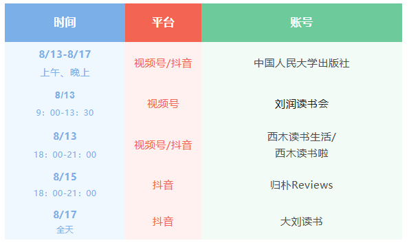 上海书展期间,中国人民大学出版社在心理、教育、文化等市民关心话题下组织多场次对谈类、带货类直播活动,邀请知名读书会、名师、新媒体达人等一起进行一场内容碰撞的盛宴,并推出惊喜折扣价!