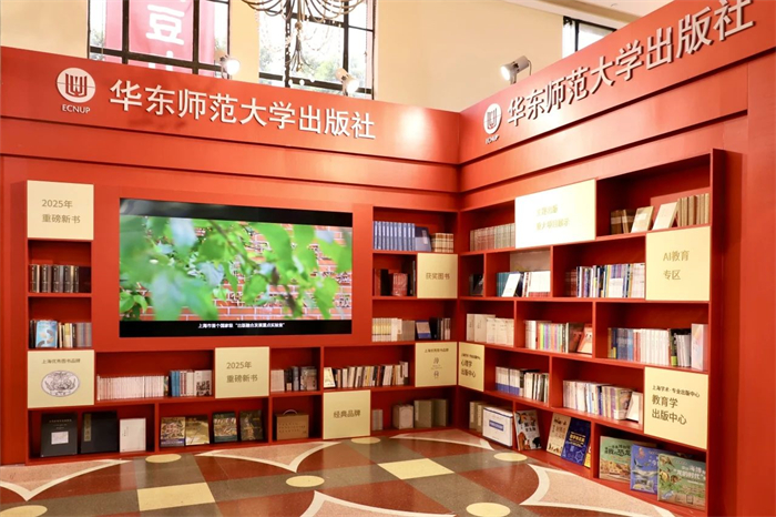 在进门的右手边,是华东师范大学出版社的精品图书展示区。本区域重点展示了主题出版、重大项目、获奖图书、AI教育等2025年重磅新书以及经典图书品牌“薄荷实验”“轻与重”等。