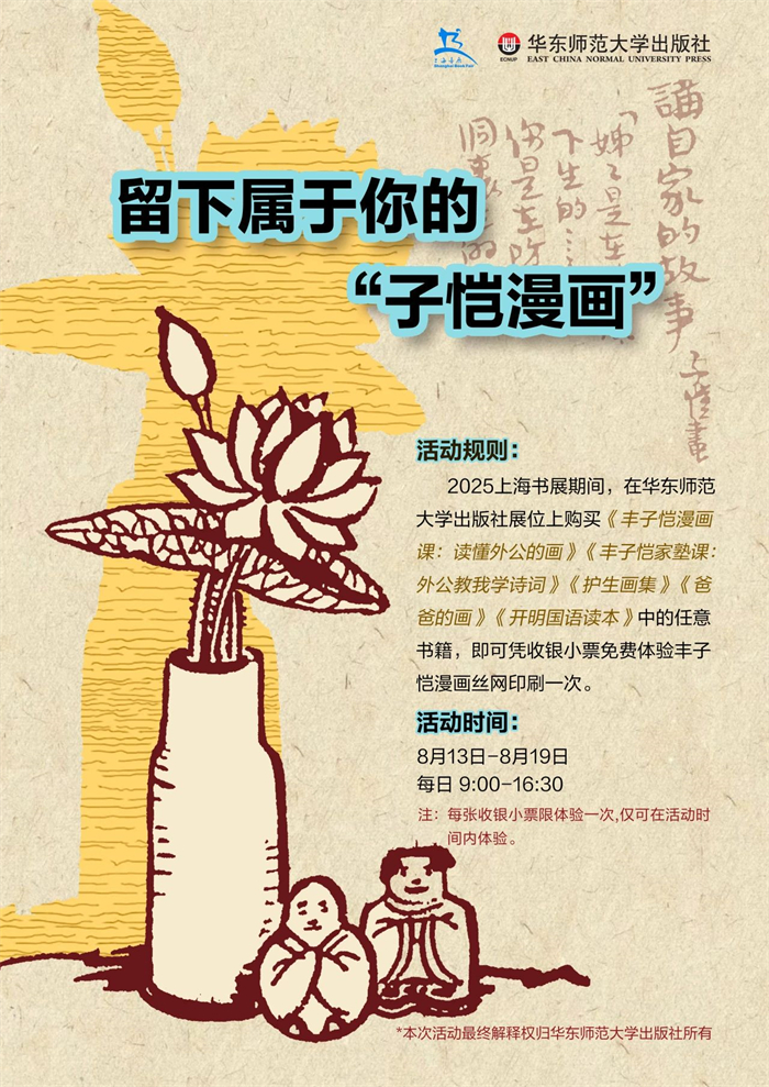 2025上海书展期间,在华东师范大学出版社展位上购买《丰子恺漫画课:读懂外公的画》《丰子恺家塾课外公教我学诗词》《护生画集》《爸爸的画》《开明国语读本》中的任意书籍,即可凭收银小票免费体验丰子恺漫画丝网印刷一次。