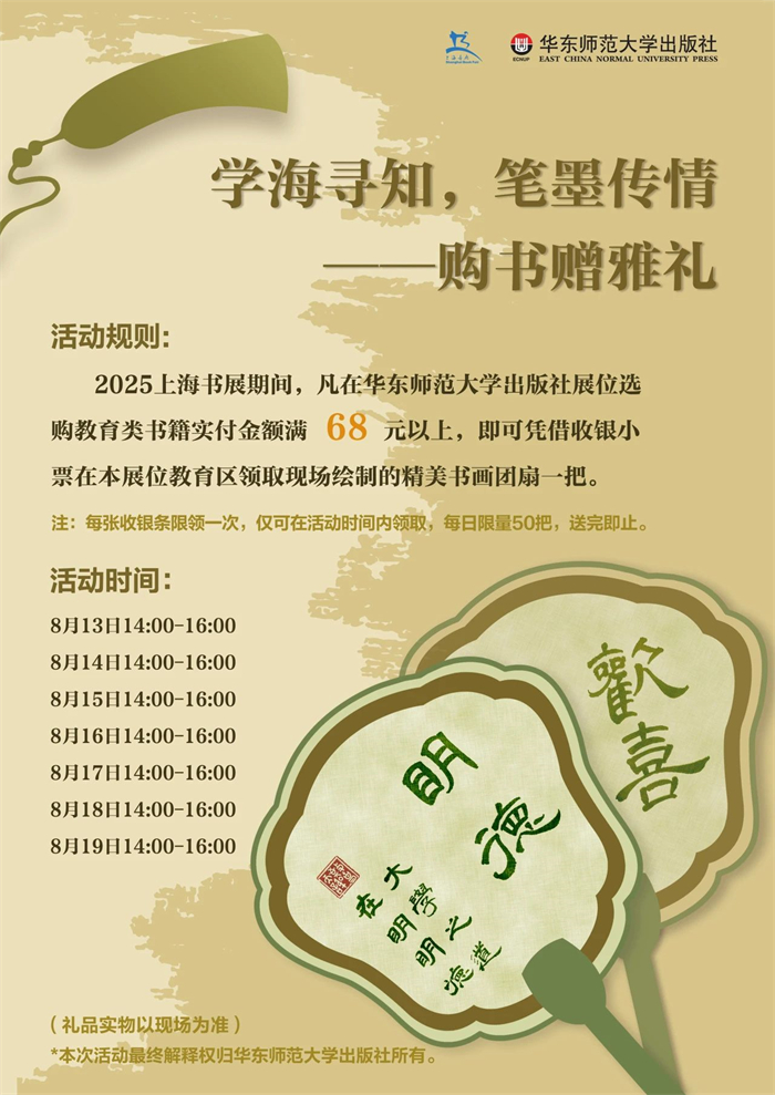 2025上海书展期间,凡在华东师范大学出版社展位选购教育类书籍实付金额满68元以上,即可凭借收银小票在本展位教育区领取现场绘制的精美书画团扇一把。