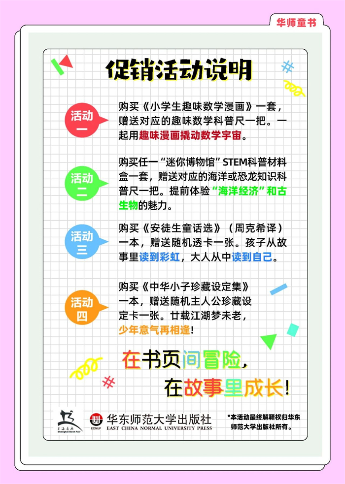 在儿童互动区,华东师范大学出版社以“数学有玄机”为起点,从“数学的历史”“生活中的数学”出发,将数学的精妙之处一一呈现在读者面前,让孩子们跟随《数学村的七彩巨人》的步伐,领略数学的魅力,探索奇妙的数学世界。