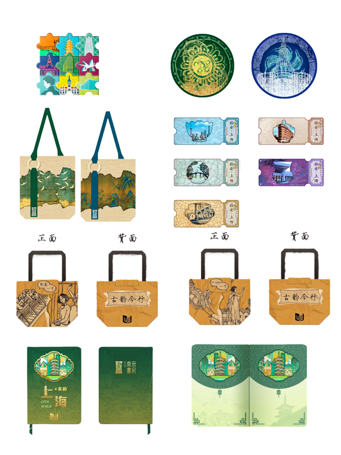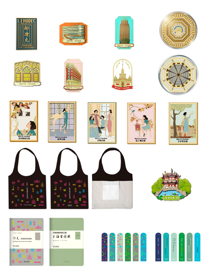 取材于经典书系的“城市行走系列”——上海外滩建筑系列流沙杯垫、邬达克建筑系列冰箱贴、张爱玲文学系列冰箱贴以及定制笔记本、帆布包、书签等(还有上海书展特别纪念款),以及以上海古园林为主角的“江南系列”——豫园冰箱贴、古园林笔记本和明信片。