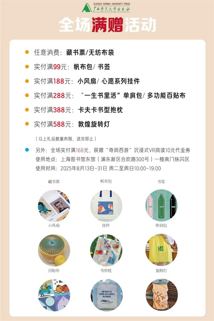 广西师范大学出版社展位全场图书5折(小部分限价品除外),还有超值文创好礼相送。购书即赠精美文创,买得越多赠品越丰厚。为了此次书展广西师范大学出版社精心准备了数万份文创礼品,赠品涵盖藏书票、挂件、百贴布、帆布包、抱枕等精美文创,让爱书人士一次收获阅读与收藏的双重喜悦。(注:赠品数量有限,先到先得)