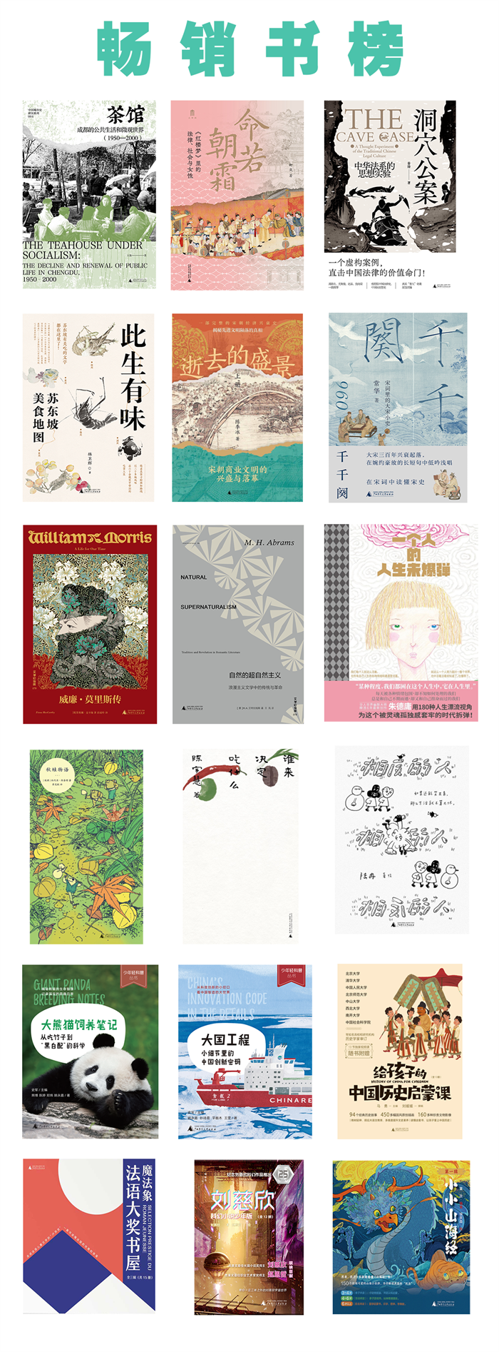 其中有往年畅销经典和获奖好书《洞穴公案:中华法系的思想实验》《动物寻古》《翦商:殷周之变与华夏新生》《地粮·新粮》《鲁迅作品(全17种)》《平如美棠:我俩的故事》《你一定爱读的极简欧洲史》《 “少年轻科普”丛书》《给孩子的中国历史启蒙课》《魔法象·法语大奖书屋》《刘慈欣科幻小说少年版》等。