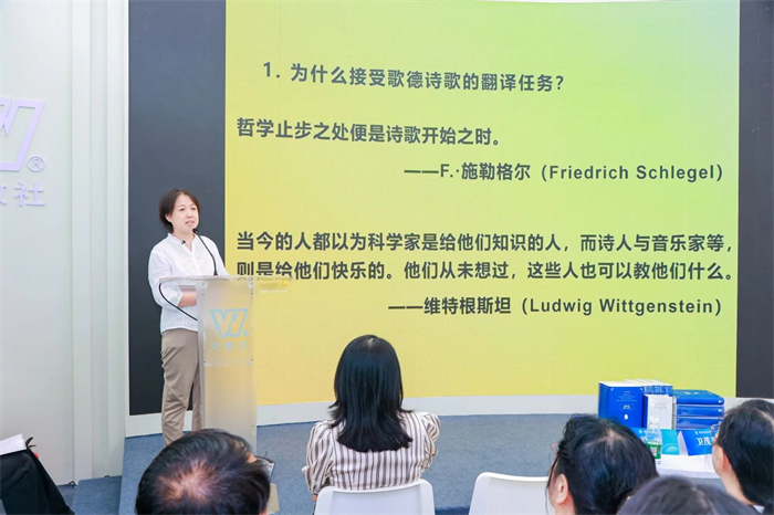 接着,姜丽生动分享了翻译老年歌德诗歌的学术心得与艺术探索。姜丽从哲学与诗歌的关系切入,引用德国浪漫主义思想家施勒格尔与哲学家维特根斯坦的名言,阐明翻译歌德诗歌的初衷:“诗歌不仅是情感的载体,更是智慧的传递。”她特别聚焦老年歌德的创作,打破“爱情属于青春,智慧属于老年”的刻板印象,通过丰富的诗作案例,展现了晚年歌德如何以诗歌记录生活、抒发哲思。在展示翻译中的“再创作”过程方面,姜丽以具体诗作为例,坦言长诗如《亚历山大·曼佐尼颂歌》需平衡韵律与语义,而短诗如讽刺诗《孔雀与印度鹅》则需在简洁中保留原作的锋芒。她还现场对比了同一首诗的三版译稿,呈现如何从直译逐步优化为“形神兼备”的汉语表达。她引用维特根斯坦“语言的边界就是世界的边界”,强调翻译不仅是语言转换,更是文化视野的拓展。观众们深刻体会到,翻译歌德诗歌既是学术挑战,也是与伟大灵魂的对话。正如她所言:“歌德拓展了我的世界,相信也会拓展你的世界。”这场报告不仅展现了翻译工作的艰辛与匠心,更揭示了经典文学跨越时空的生命力,为中德文化交流注入了新的学术温度。