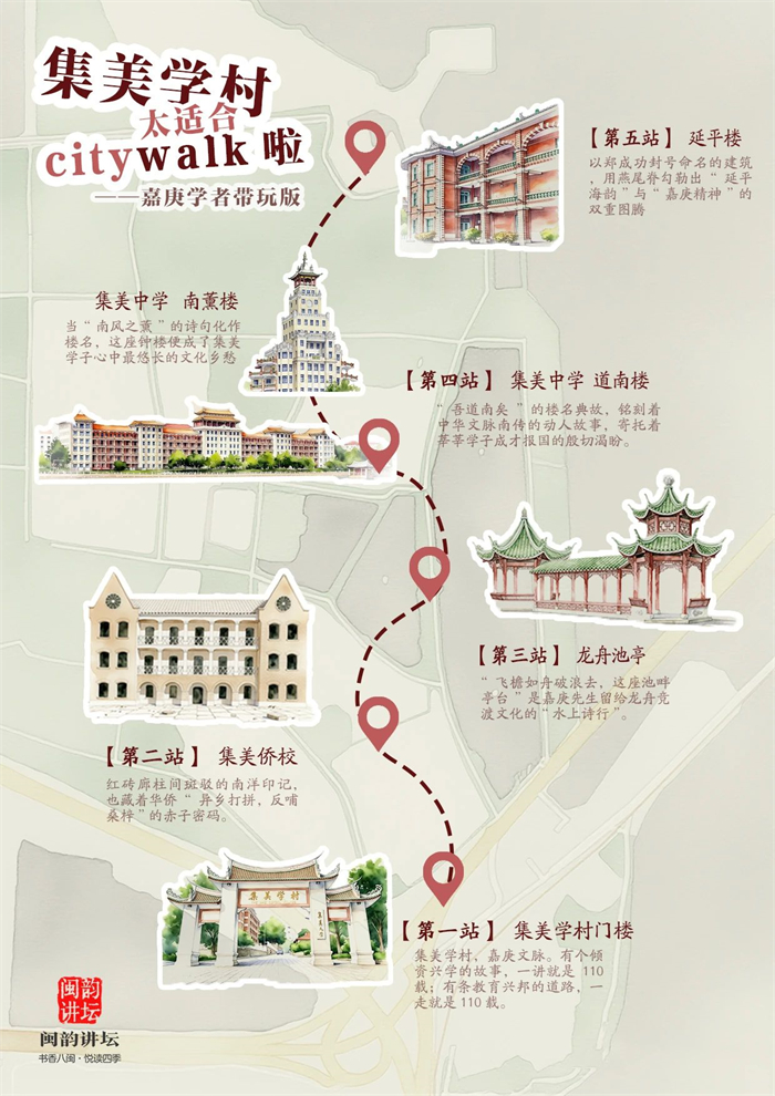 跟随嘉庚学者廖永健教授的脚步,开启一场沉浸式的集美学村建筑文化之旅。从巍峨的集美学村门楼出发,触摸陈嘉庚先生"教育兴国"的初心;漫步至集美侨校,聆听华侨支援故土的赤子故事;驻足龙舟池亭,感受中西合璧的建筑美学;仰望道南楼与南薰楼的恢弘身影,读懂楼名中蕴含的"教化南洋"的深远寄望;最后抵达延平楼,在郑成功精神的象征之地,完成这场跨越时空的文化对话。