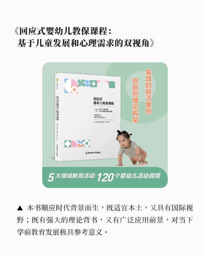 面对人口发展新形势和“幼有所育”的民生期盼,南京师范大学出版社始终将服务国家战略、勇担社会责任放在首位。通过系统构建科学托育资源体系、研发本土化课程方案、赋能专业人才成长、夯实行业理论基础等一系列扎实行动,南师出版正努力走出一条助力普惠托育服务体系高质量发展的坚实道路。南师出版持续审视托育教师与家庭的核心需求,致力于让专业研究成果转化为提升保育质量、支持科学养育的实际力量,为缓解家庭育儿焦虑、促进婴幼儿健康成长、服务国家人口长期均衡发展目标,贡献不可或缺的出版智慧与力量。