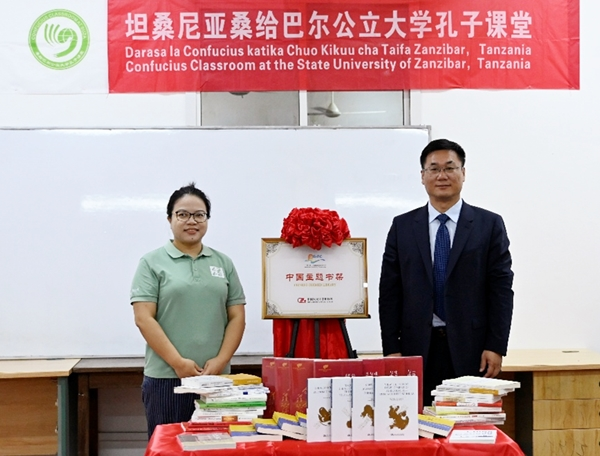 代表团访问了坦桑尼亚桑给巴尔公立大学孔子课堂,捐赠中国主题书架,并与钱明敏院长就当地汉语教学、图书需求等开展深入交流。